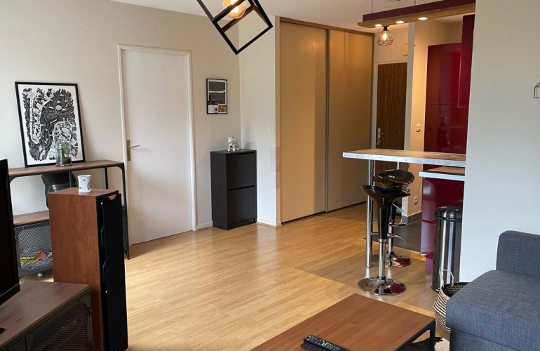 ORLEANS SUD, QUARTIER MOUILLERE, F2 de 43m2 comprenant entrée, séjour sur balcon, cuisine équipée (frigo et plaques à disposition), chambre avec balcon, salle de bains + WC. Un garage PRIVATIF. Chauffage individuel électrique. Libre début juin. Résidence sécurisée.