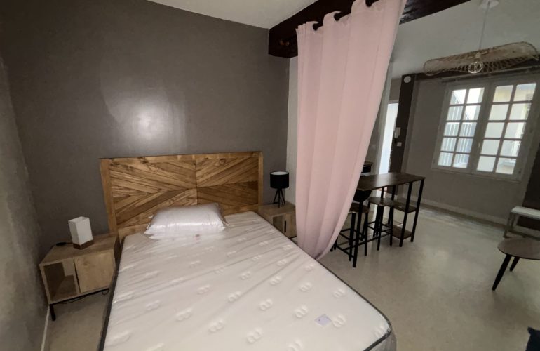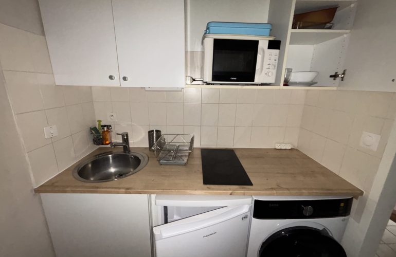 Il se compose d’une entrée avec placard, d’une pièce principale comprenant un coin cuisine équipé (plaque de cuisson, micro-ondes, lave-linge, réfrigérateur), d’un coin nuit, ainsi que d’une salle de bains.
