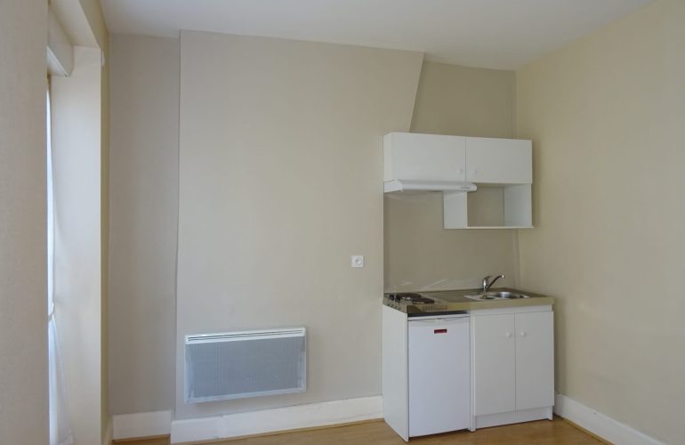 ORLEANS CENTRE VILLE, AU CALME, F1 BIS de 26.20m2 comprenant pièce principale avec kitchenette équipée (2 plaques et un frigo), chambre avec placard, salle d’eau + WC. Chauffage individuel électrique. Libre.